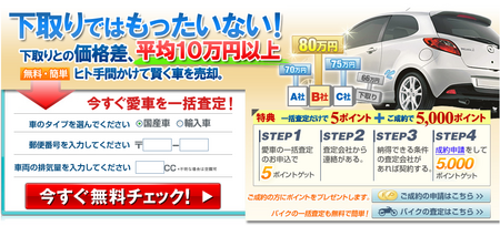 見積り査定の申込みをすればもれなく5ポイント。その後、ご成約(車を売却)した方には、さらに5,000ポイントをプレゼントいたします。